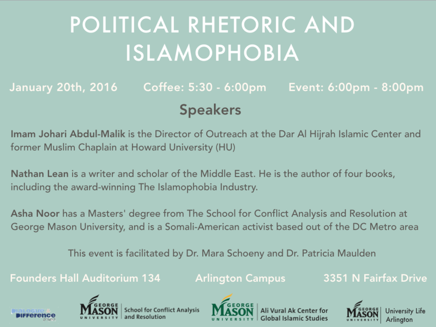 Find more information at: http://scar.gmu.edu/event/political-rhetoric-and-islamophobia